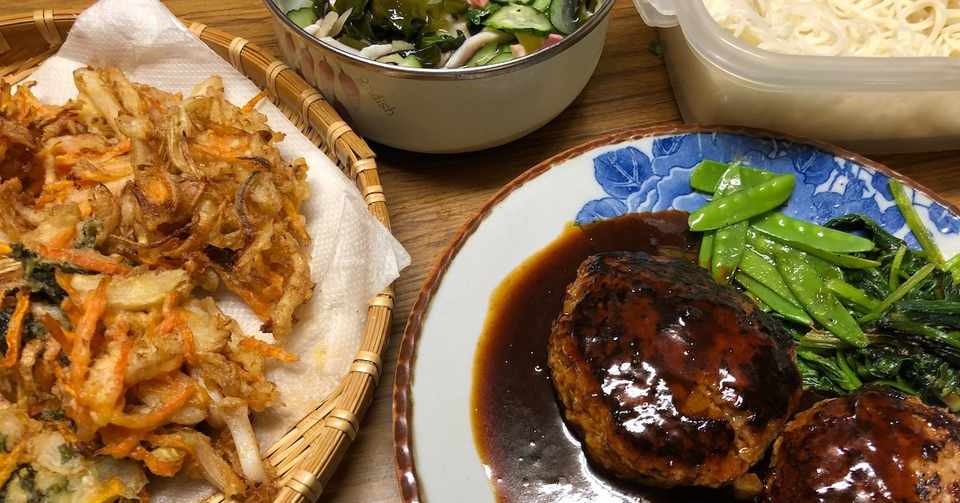 イカと野菜のかき揚げと手ごねハンバーグ タコの酢の物 あと山盛りそうめん じじょうくみこ Note
