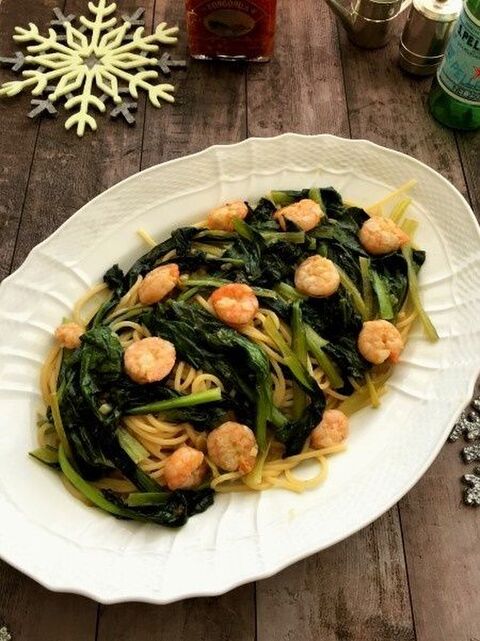 たっ ぷりの小松菜とエビのアーリオ オーリオ ペペロンチーノ風スパゲッティ 暮らしニスタ