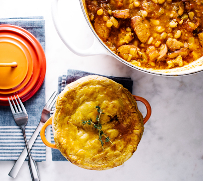ソーセージとかぼちゃのポットパイ かぼちゃのサラダ ル クルーゼ Le Creuset