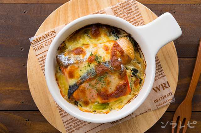 ホワイトソースいらず鮭と小松菜のチーズ焼きのレシピ ソラレピ