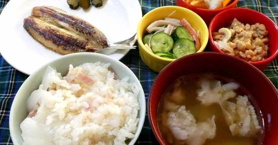 あおみか 昨日の夕飯 いよいよメニューに行き詰まり 笑 この前相葉マナブで見た新玉ねぎの炊き込みご飯作ってみたよん 炊飯器開けると玉ねぎが丸ごとドーン って入ってるの面白い シンプルな材料だけど新玉ねぎの甘みと豚バラの旨味が出てて