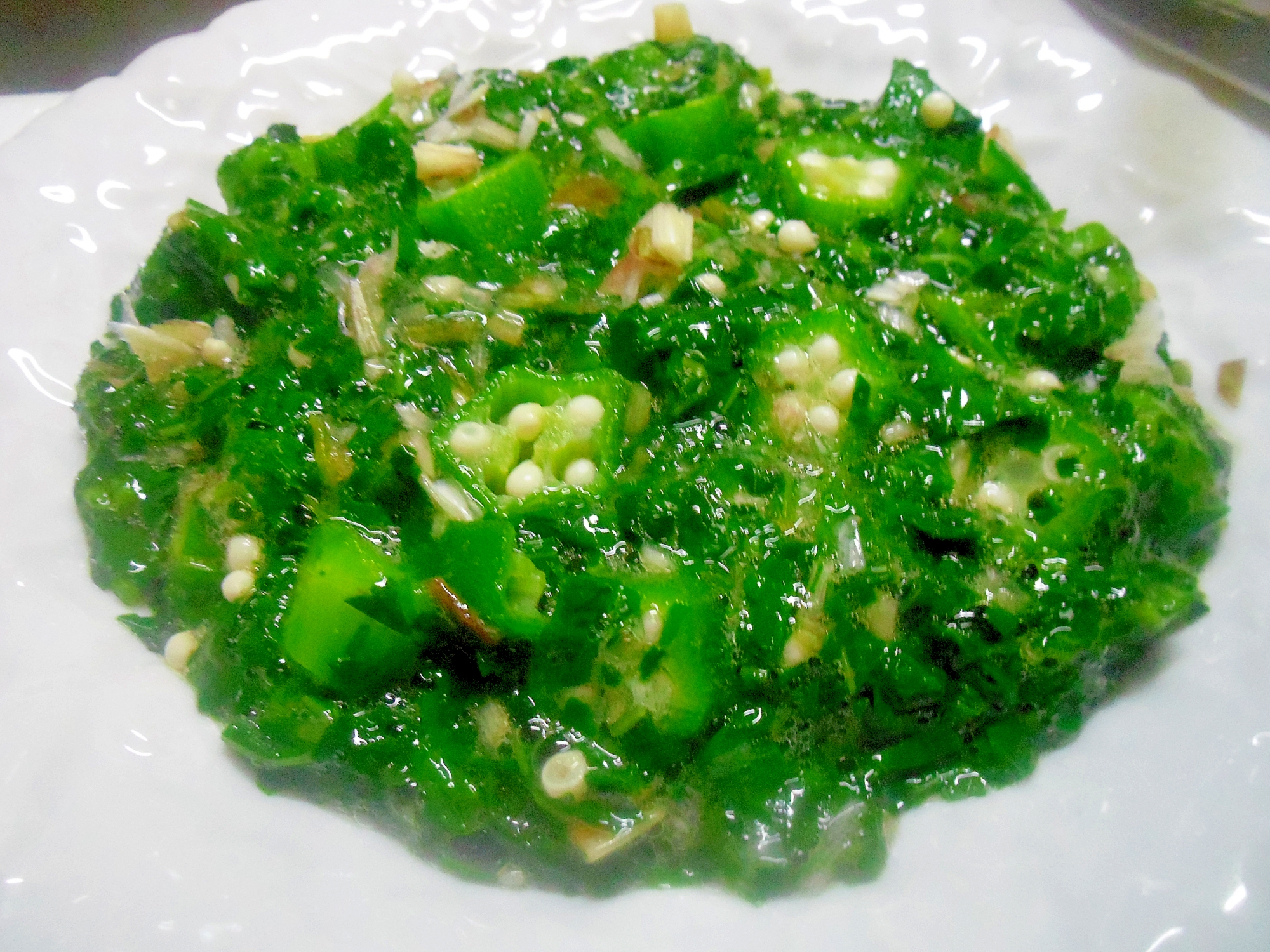 オクラとモロヘイヤのショウガ風味おひたし 野菜だけで一品レシピ みんなの趣味の園芸 園芸 ガーデニングの情報交換コミュニティサイト